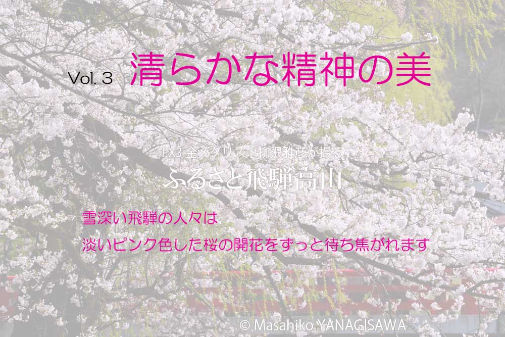【 飛騨高山インターネット写真展開催のお知らせ 】 高山市制施行80周年の節目に、地元出身の写真家・柳沢雅彦は国際フォトコンテストPX3(Prix de la Photographie Paris)で金メダルを獲得いたしました。 それを記念して柳沢は、ふるさとへの愛と感謝の気持ちを込め国内外向けのインターネット写真展を1年間(2017年1月1日~12月31日)開催いたします。 ご存知のように高山市はミシュランガイドで京都、奈良とともに日本を代表する国際観光都市に選ばれました。 世界じゅうから観光客が訪れる飛騨高山の魅力を皆様どうぞお楽しみください。 In 2016, the 80th anniversary of the establishment of the municipality of Takayama City, Takayama-born photographer Masahiko Yanagisawa won the Gold Prize in Prix de la Photographie Paris (PX3). To celebrate the occasion, Yanagisawa will post photographs of Takayama City on the Internet for a year(from 1st of January 2017 to 31st of December) for viewing by people in Japan and around the world as a show of love and gratitude for his hometown. As you may know, Takayama City is named in the Michelin Guide as an international tourist destination like Kyoto and Nara. Hida Takayama welcomes international visitors and encourages them to discover the charms and attractions of the city. Vol.3 … People in snowy regions really look forward to the start of pink cherry blossom season.
